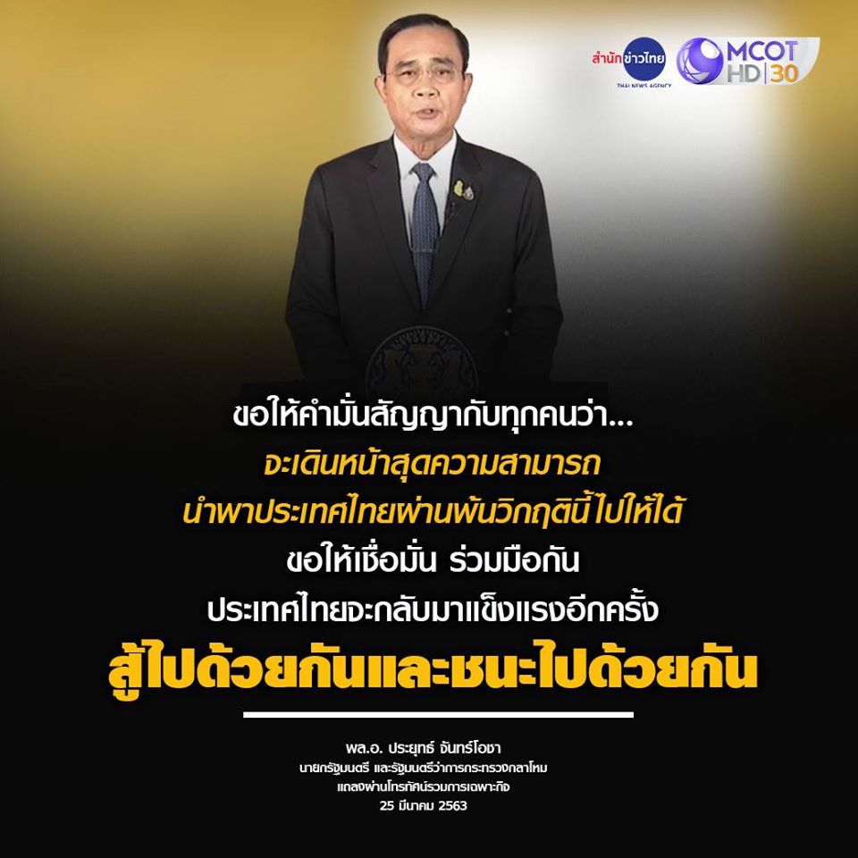 “ขอให้คำมั่นสัญญากับทุกคนว • นายกฯ แถลงการณ์ยกระดับทุกมิติในการควบคุมการแพร่ระบาดของโควิด-19 ดังนี้ -หยุดการแพร่ระบาดและลดผลกระทบทางเศรษฐกิจ