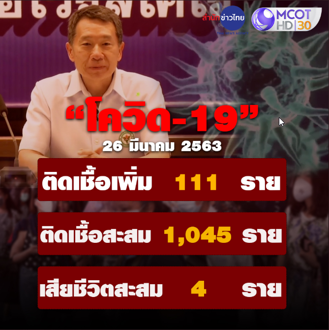 สำนักข่าวไทย : 26 มี.ค. 63 – กระทรวงสาธาณสุขแถลงสถานการณ์โรคโควิด-19 วันนี้ 26 มี.ค. 63 โดย นพ. อนุพงษ์ สุจริยากุล ผู้ทรงคุณวุฒิกรมควบคุมโรค พบผู้ป่วยเพิ่ม 111 ราย ยอดสะสมพุ่ง 1,045 ราย บุคลากรทางการแพทย์ติดเชื้อรวม 9 ราย โดยผู้ป่วยมีแนวโน้มคงที่ หลักร้อยต่อวัน