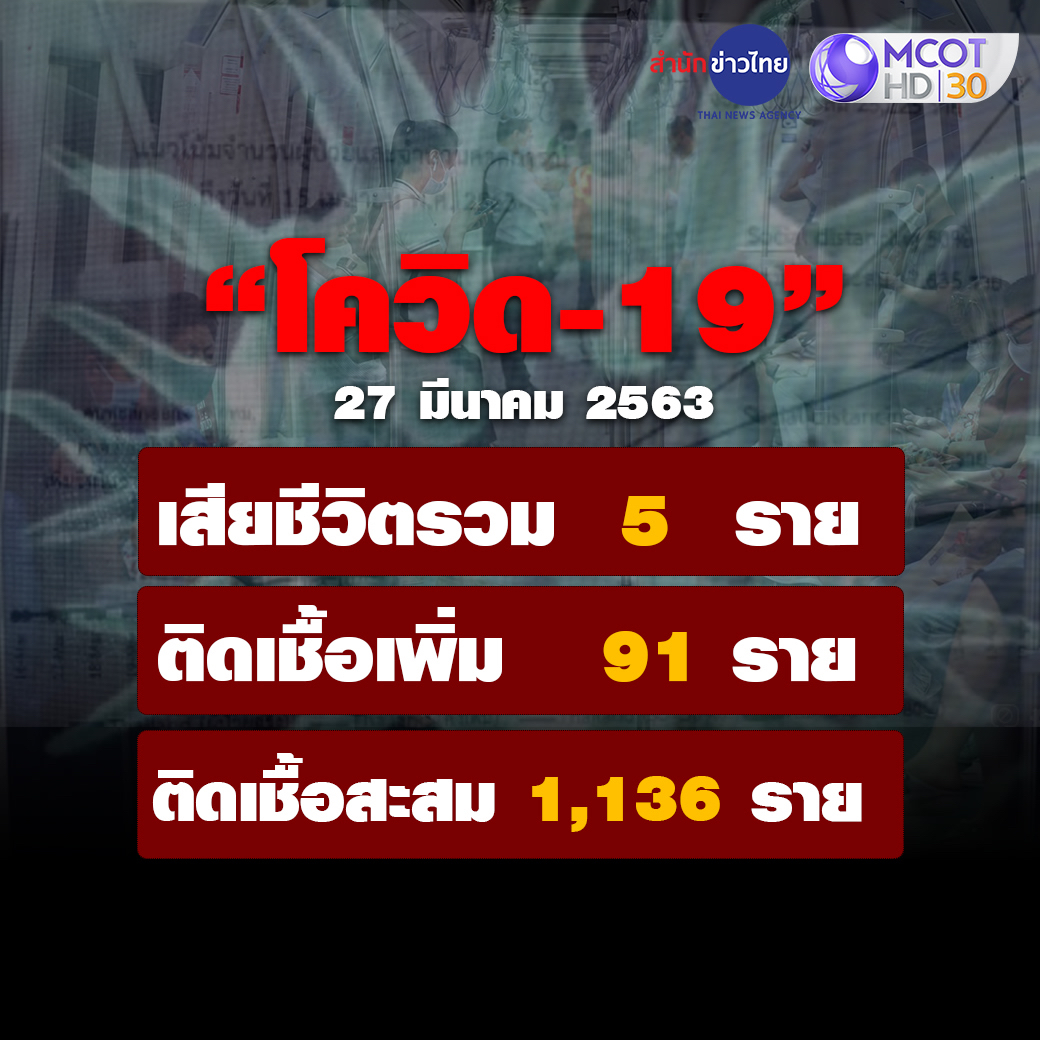 สำนักข่าวไทย : 27 มี.ค. 63 – กระทรวงสาธาณสุขแถลงสถานการณ์โรคโควิด-19 วันนี้ 27 มี.ค. 63 ไทยติดเชื้อโควิด-19 เพิ่ม 91 สะสม 1,136 ตายเพิ่ม 1 รวม 5 ราย