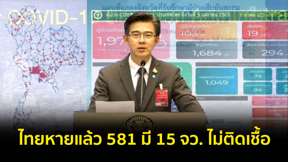 สำนักข่าวไทย 3 เม.ย. 63 – แถลงการณ์ศูนย์บริหารสถานการณ์โควิด-19 (ศบค.) โดย นพ.ทวีศิลป์ วิษณุโยธิน โฆษก ศบค. ประจำวันที่ 3 เม.ย. 63 ไทยติดเชื้อเพิ่ม 103 ราย หายแล้ว 581 ราย เหลือ 15 จังหวัดไม่มีผู้ติดเชื้อ