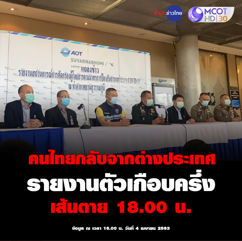 สำนักข่าวไทย 4 เม.ย. 63 – ฝ่ายที่เกี่ยวข้องกรณีการคัดกรองที่สนามบินสุวรรณภูมิ เมื่อคืนนี้ (3 เม.ย. 63) แถลงการณ์สถานการณ์ตามมาตรการป้องกันการแพร่ระบาดโควิด-19 ณ ท่าอากาศยานสุวรรณภูมิ ย้ำผู้เดินทางจากต่างประเทศ เมื่อ 3 เม.ย. 63 รายงานตัวด่วน ก่อน 18.00 น. หากไม่มารายงานตัว จะดำเนินการตามกฎหมาย