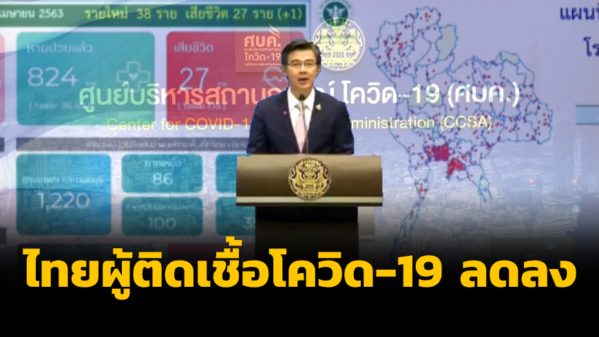 สำนักข่าวไทย 7 เม.ย. 63 – แถลงการณ์ศูนย์บริหารสถานการณ์โควิด-19 (ศบค.) โดย นพ.ทวีศิลป์ วิษณุโยธิน โฆษก ศบค. ประจำวันที่ 7 เม.ย. 63 ผู้ป่วยใหม่ลดลง เสียชีวิตเพิ่มอีก 1