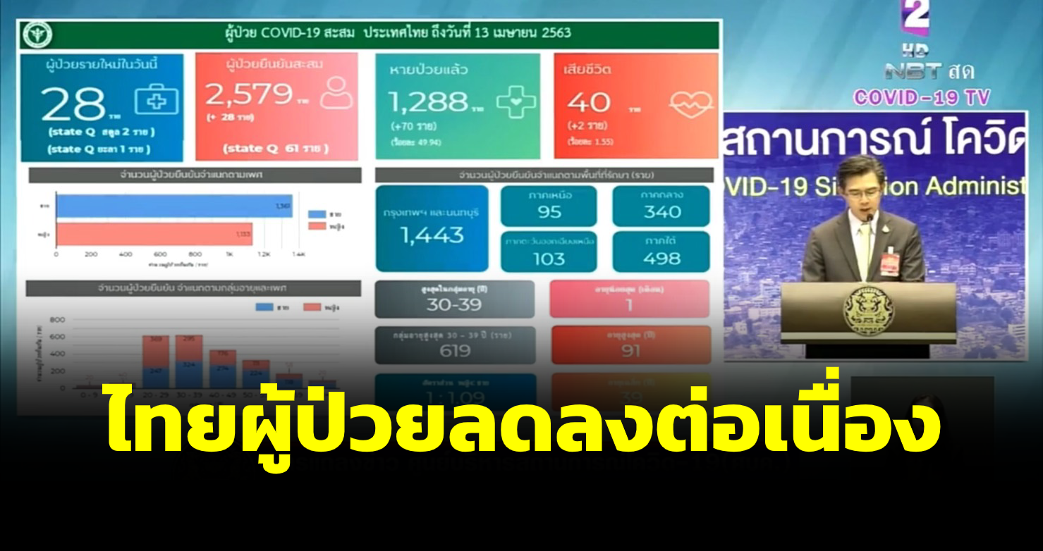สำนักข่าวไทย 13 เม.ย. 63 – แถลงการณ์ศูนย์บริหารสถานการณ์โควิด-19 (ศบค.) โดย นพ.ทวีศิลป์ วิษณุโยธิน โฆษก ศบค. ติดเชื้อเพิ่ม 28 ราย ตายเพิ่ม 2 ราย ตัวเลขผู้ติดเชื้อลดลงต่อเนื่อง