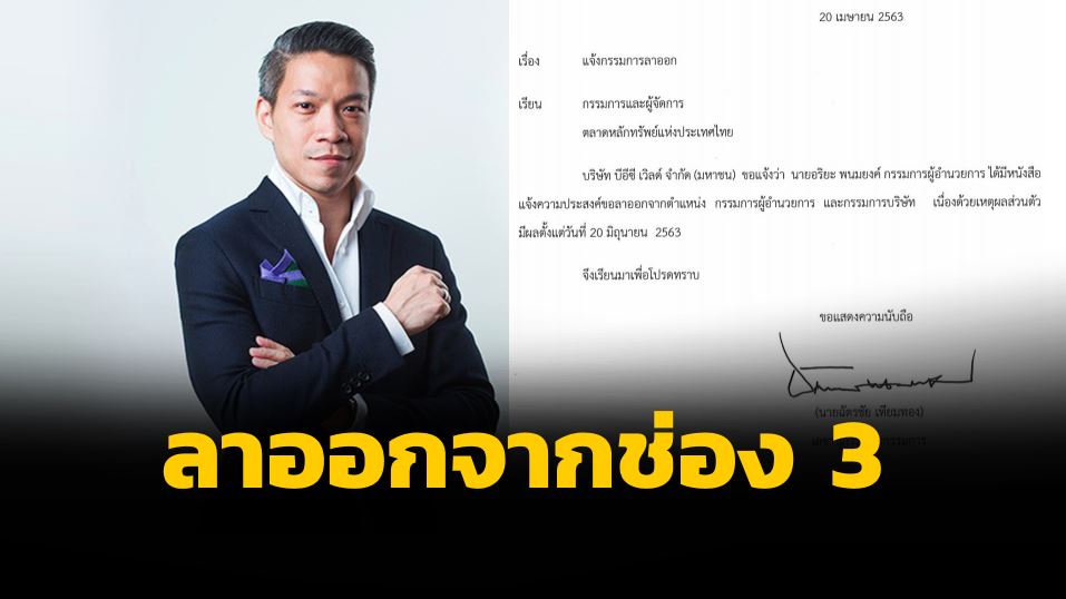 “อริยะ พนมยงค์” ลาออกจากกรรมการผู้อำนวยการและกรรมการบริษัท บริษัท บีอีซี เวิลด์ จำกัด (มหาชน) มีผลตั้งแต่ 20 มิถุนายน 2563 โดยให้เหตุผลส่วนตัว