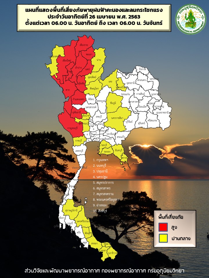 อุตุฯ เตือนไทยตอนบนมีพายุฤดูร้อน ฝนฟ้าคะนอง ลมกระโชกแรง และมีลูกเห็บตกบางพื้นที่ รวมถึงอาจมีฟ้าผ่าเกิดขึ้นได้ หลีกเลี่ยงการอยู่ในที่โล่งแจ้ง ใต้ต้นไม้ใหญ่ สิ่งปลูกสร้าง และป้ายโฆษณาที่ไม่แข็งแรง สำหรับภาคใต้มีฝนฟ้าคะนองเพิ่มขึ้น ตกหนักบางพื้นที่ และมีลมกระโชกแรง อ่าวไทยตอนล่างตั้งแต่ จ.สุราษฎร์ธานี ลงไป คลื่นสูงประมาณ 2 เมตร