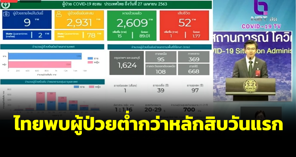 สำนักข่าวไทย 27 เม.ย. 63 – สถานการณ์โรคโควิด-19 ในไทย พบผู้ป่วยรายใหม่เพียง 9 ราย ซึ่งต่ำกว่าหลักสิบเป็นวันแรก ผู้ป่วยสะสมทั้งหมด 2,931 ราย หายป่วยแล้ว 2,609 ราย เสียชีวิตเพิ่ม 1 ราย หญิงไทย อายุ 64 ปี มีโรคประจำตัว และในวันนี้ กทม. ไม่พบผู้ป่วยในพื้นที่เป็นครั้งแรก
