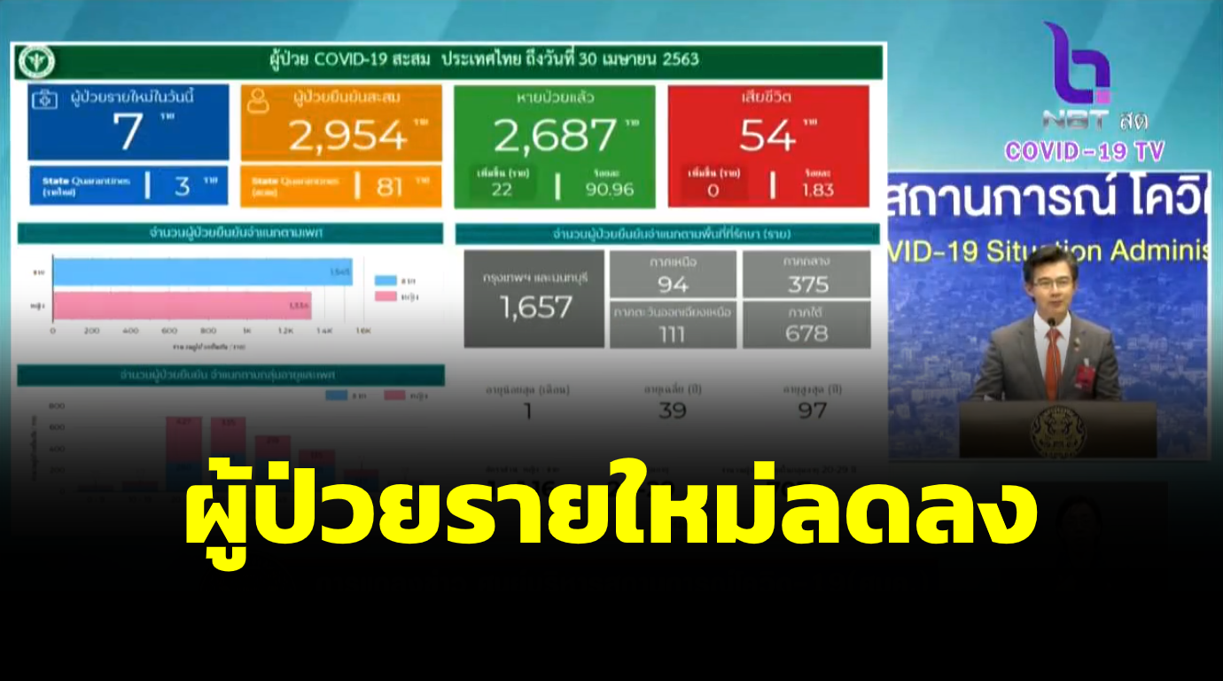 สำนักข่าวไทย 30 เม.ย. 63 – สถานการณ์โรคโควิด-19 ในไทย พบผู้ติดเชื้อรายใหม่เพียง 7 ราย สะสะม 2,954 ราย หายป่วยแล้ว 2,687 ราย ไม่มีผู้เสียชีวิตเพิ่ม และเป็นครั้งแรกที่ไม่พบผู้ป่วยจากระบบเฝ้าระวังและระบบบริการฯ