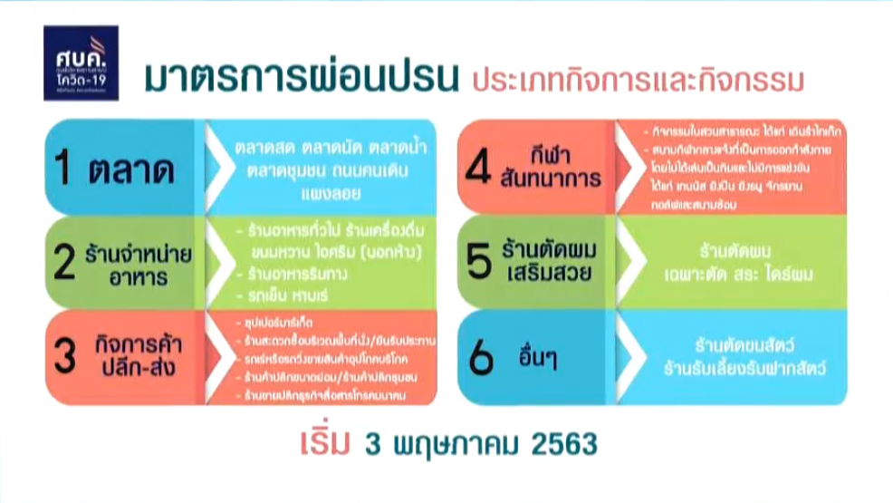 มาตรการผ่อนปรน 6 ประเภทกิจการและกิจกรรม เริ่ม 3 พ.ค. ดังนี้