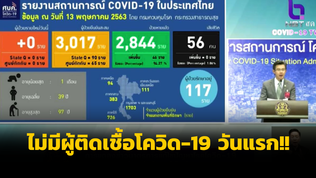 สำนักข่าวไทย 13 พ.ค. 63 – ไทยไม่พบผู้ป่วยรายใหม่เป็นวันแรก ทำให้จำนวนผู้ป่วยสะสมมี 3,017 รายเท่าเดิม หายป่วยแล้ว 2,844 รายและไม่มีผู้เสียชีวิตเพิ่ม ย้ำให้คนไทยไม่ประมาท