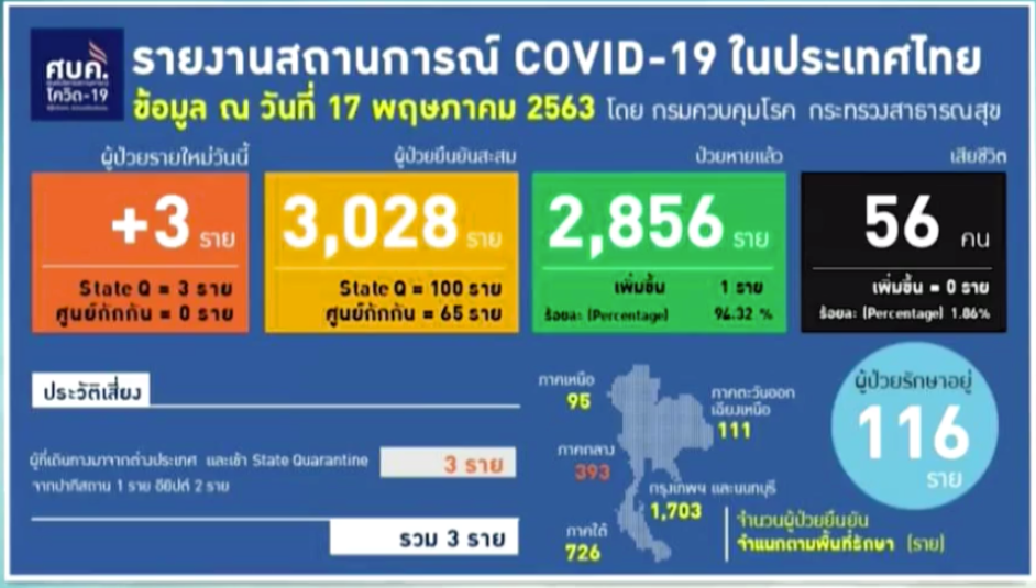 สำนักข่าวไทย 17 พ.ค. 63 – สถานการณ์โรคโควิด-19 ในไทยพบผู้ป่วยรายใหม่ 3 ราย เป็นผู้ที่เดินทางกลับมาจากต่างประเทศ เป็นเพศชายทั้งหมด ไม่มีผู้เสียชีวิตเพิ่ม