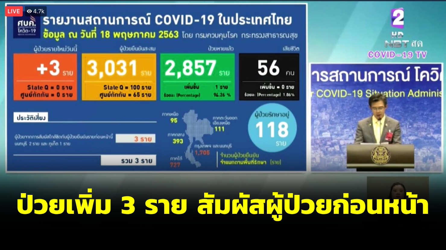 สำนักข่าวไทย 18 พ.ค. 63 – สถานการณ์โรคโควิด-19 ไทยพบผู้ป่วยรายใหม่ 3 ราย จากการสัมผัสผู้ป่วยยืนยันก่อนหน้า ผู้ป่วยสะสมเพิ่มเป็น 3,031 ราย หายป่วยแล้ว 2,857 ราย ไม่มีผู้เสียชีวิตเพิ่ม