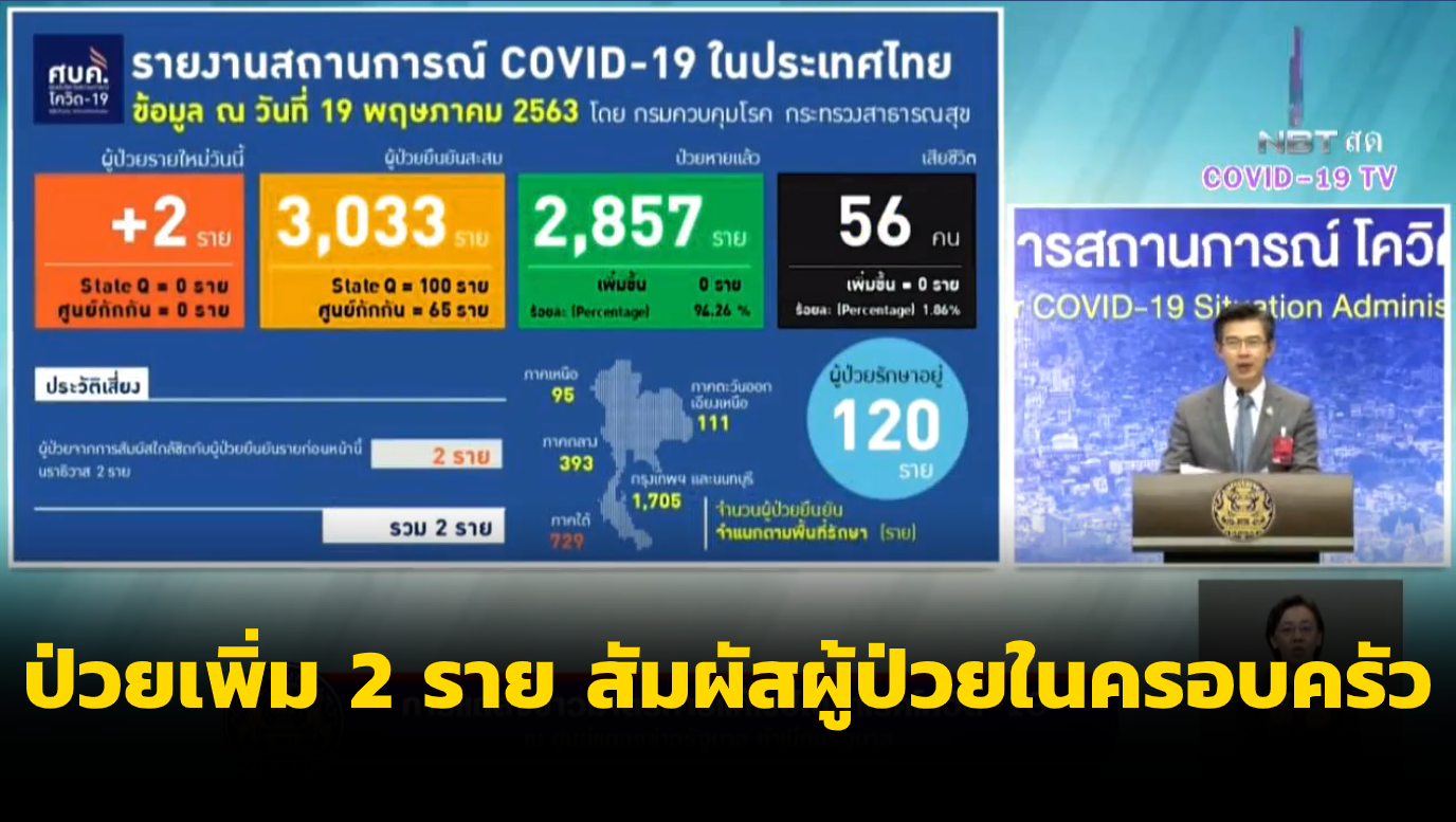 สำนักข่าวไทย 19 พ.ค. 63 – สถานการณ์โรคโควิด-19 ในไทยพบผู้ป่วยรายใหม่ 2 ราย จากการสัมผัสผู้ป่วยก่อนหน้าในครอบครัวเดียวกัน ป่วยสะสม 3,033 ราย หายป่วยคงที่ 2,857 รายและไม่มีผู้เสียชีวิตเพิ่ม