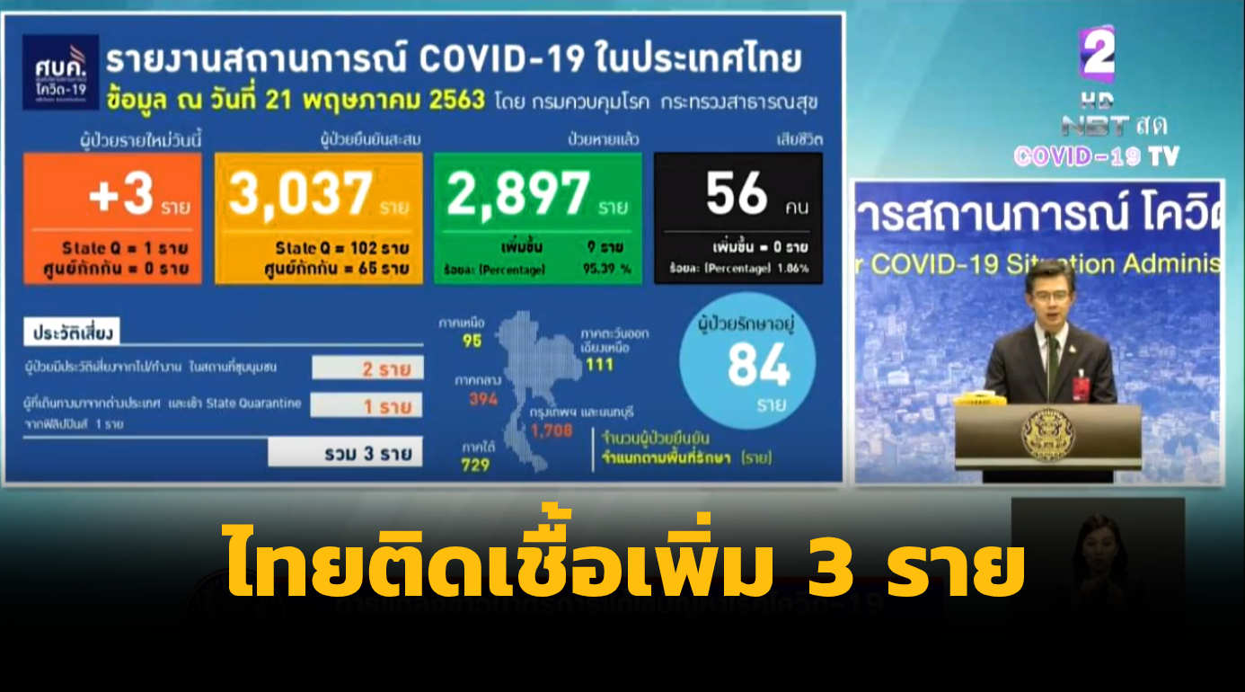 สำนักข่าวไทย 21 พ.ค. 63 – สถานการณ์โรคโควิด-19 ไทยพบผู้ป่วยรายใหม่ 3 ราย จากระบบเฝ้าระวังและระบบบริการฯ และ State Quarantine สะสม 3,037 ราย รักษาในโรงพยาบาล 84 ราย หายป่วยแล้ว 2,897 ราย ผู้เสียชีวิตคงที่ 56 ราย