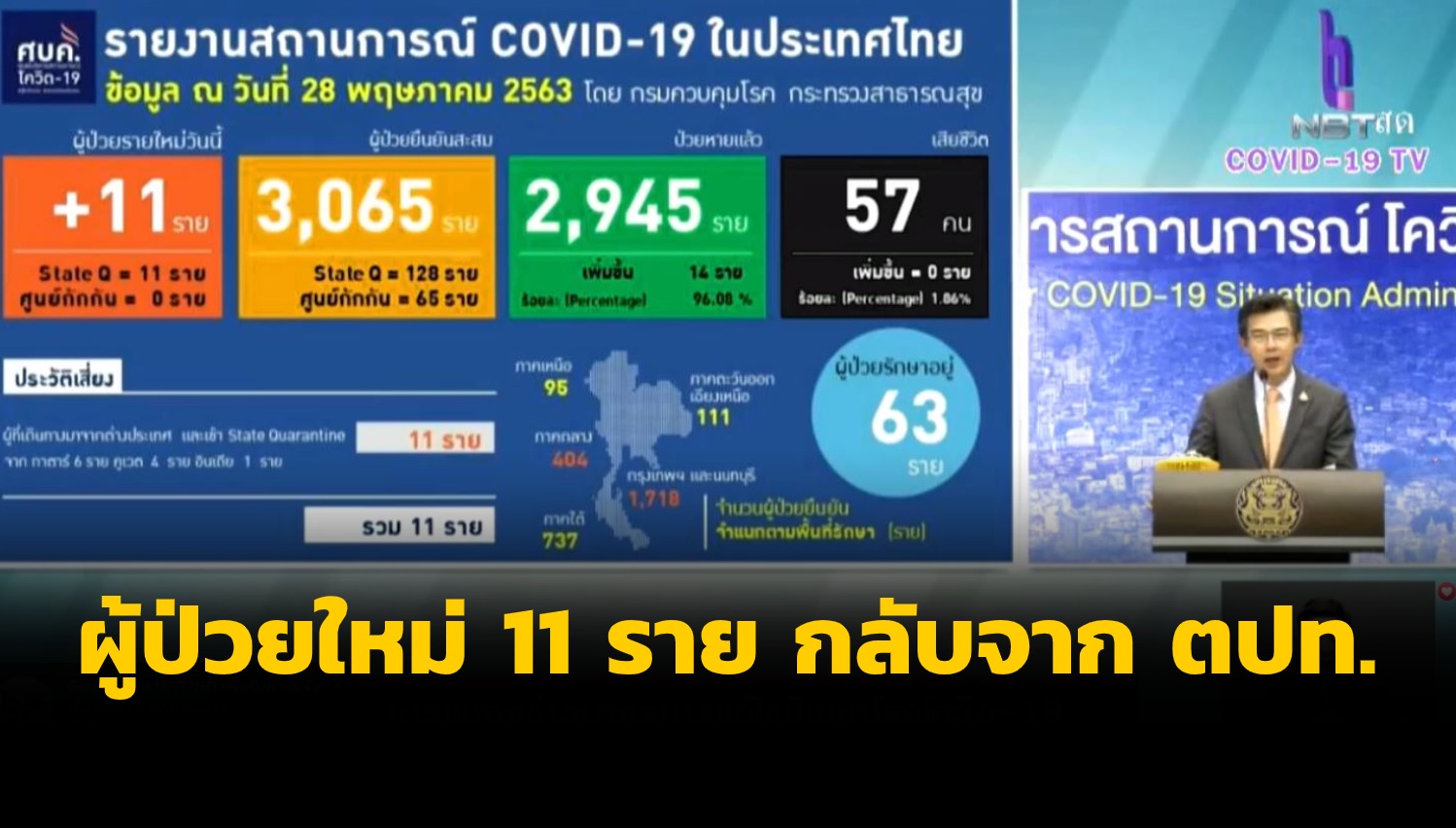 สำนักข่าวไทย 26 พ.ค. 63 – สถานการณ์โรคโควิด-19 ไทยพบผู้ป่วยรายใหม่ 11 ราย จาก State Quarantine กลัมาจากประเทศอินเดีย กาตาร์ และคูเวต ผู้ป่วยสะสม 3,065 ราย หายป่วยแล้ว 2,945 ราย รักษาในโรงพยาบาล 63 ราย เสียชีวิตคงที่ 57 ราย