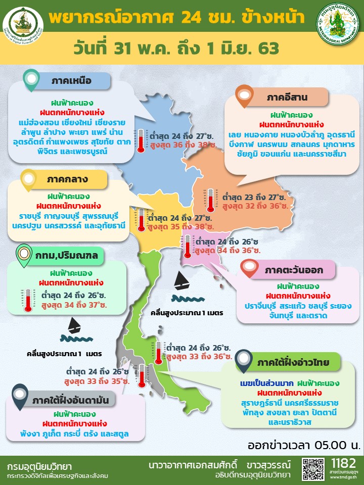 กรมอุตุฯ พยากรณ์อากาศ 24 ชม.ข้างหน้า ประเทศไทยมีฝนตกหนักบางแห่งในภาคเหนือ ภาคอีสานตอนบน ภาคตะวันออก ภาคกลาง และภาคใต้ ขอให้ประชาชนระวังอันตรายจากฝนตกหนัก-ฝนตกสะสม น้ำท่วมฉับพลันและน้ำป่าไหลหลาก ขณะที่ กทม.-ปริมณฑล มีฝนฟ้าคะนอง 30% ของพื้นที่ ตกหนักบางแห่ง