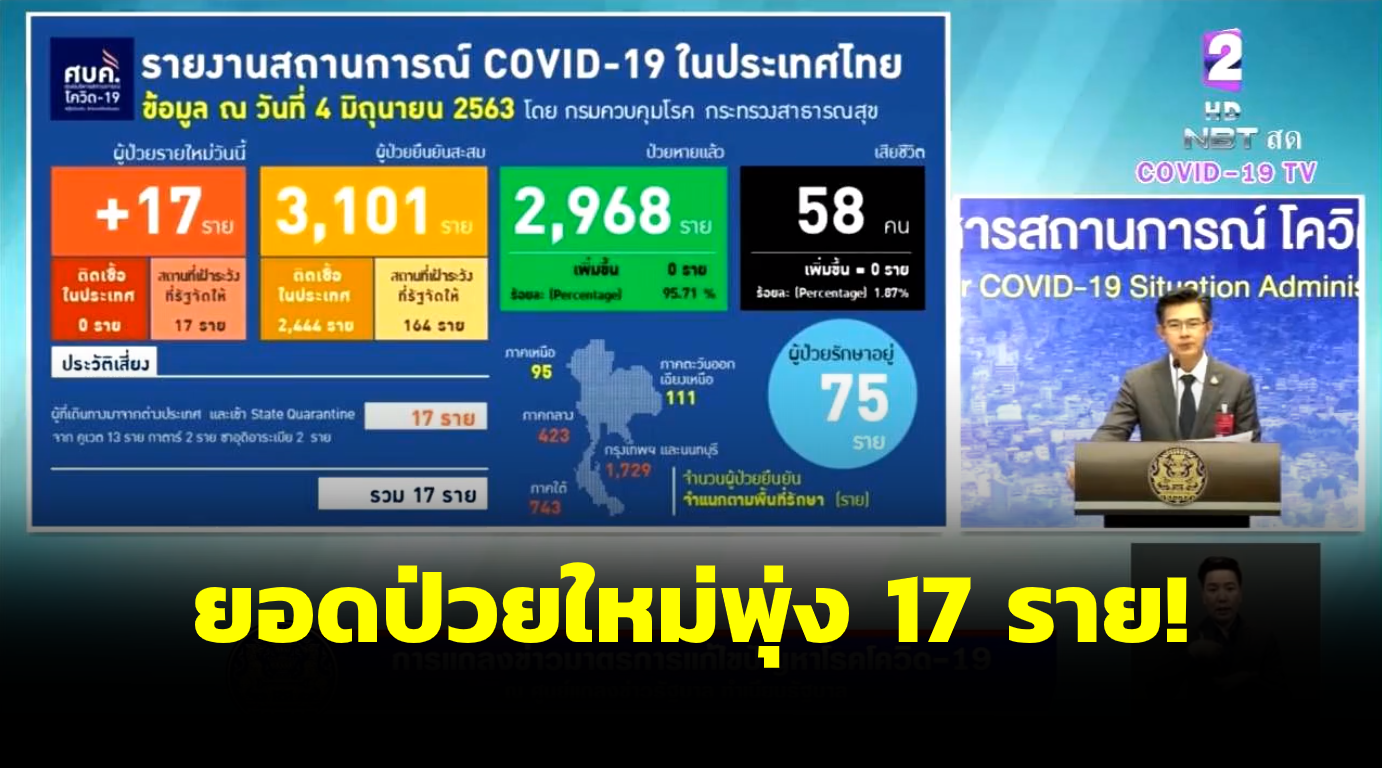สำนักข่าวไทย 3 มิ.ย. 63 – สถานการณ์โรคโควิด-19 ไทยพบผู้ป่วยรายใหม่ 17 ราย มาจากต่างประเทศ ผู้ป่วยสะสม 3,101 ราย รักษาใน รพ. 75 ราย ไม่มีตายเพิ่ม