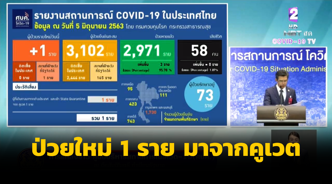 สำนักข่าวไทย 3 มิ.ย. 63 – สถานการณ์โรคโควิด-19 ไทยพบผู้ป่วยรายใหม่ 1 ราย มาจากประเทศคูเวตและเข้า State Quarantine สะสม 3,102 ราย ป่วยแล้ว 2,971 ราย รักษาในโรงพยาบาล 73 ราย เสียชีวิตคงที่ 58 ราย