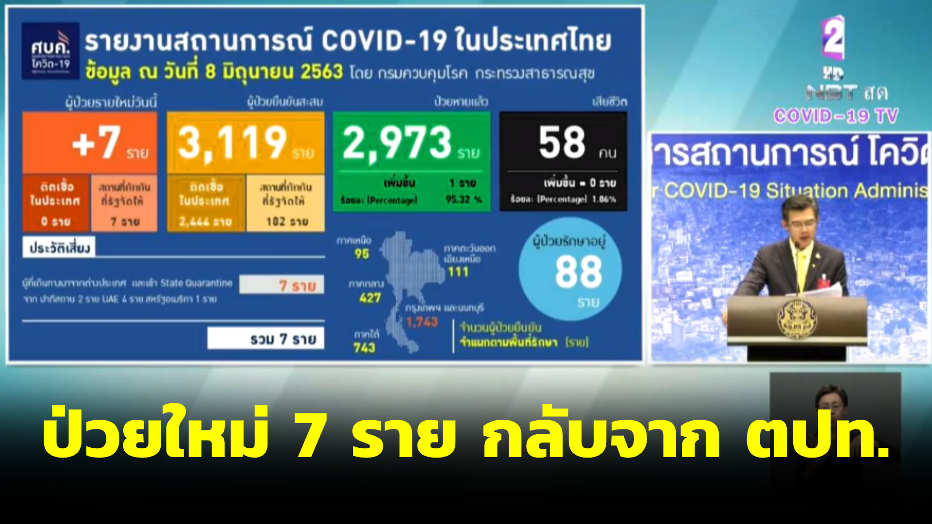 สำนักข่าวไทย 8 มิ.ย. 63 – สถานการณ์โรคโควิด-19 ไทยพบผู้ป่วยรายใหม่ 7 ราย กลับจากต่างประเทศ และเข้าพักที่ State Quarantine สะสม 3,119 ราย หายป่วยแล้ว 2,973 ราย รักษาในโรงพยาบาล 88 ราย ไม่มีผู้เสียชีวิตเพิ่ม