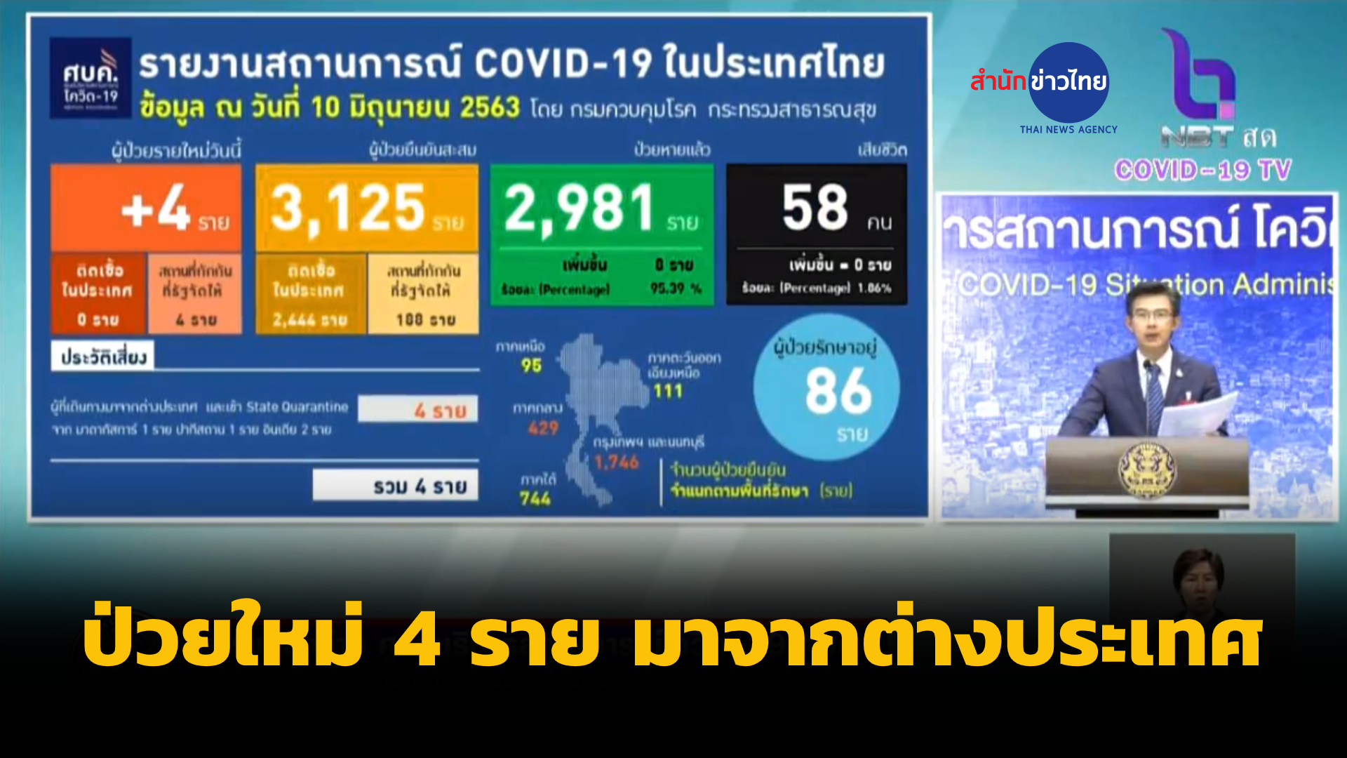 สำนักข่าวไทย 10 มิ.ย. 63 – สถานการณ์โรคโควิด-19 ไทยพบผู้ป่วยรายใหม่ 4 ราย มาจากต่างประเทศและเข้า State Quarantine สะสม 3,125 ราย หายป่วยแล้ว 2,981 ราย รักษาในโรงพยาบาล 86 ราย ไม่มีผู้เสียชีวิตเพิ่ม