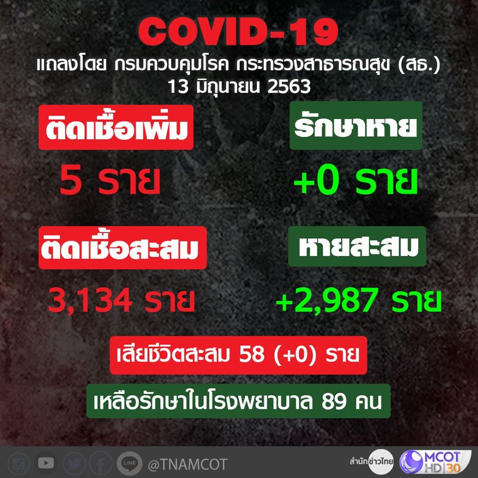 สำนักข่าวไทย 13 มิ.ย. 63 – สถานการณ์โรคโควิด-19 พบผู้ป่วยรายใหม่ 5 ราย มาจากซาอุฯ และเข้า State Quarantine ผู้ป่วยสะสม 3,134 ราย รักษาในโรงพยาบาล 89 ราย ไม่มีผู้เสียชีวิตเพิ่ม