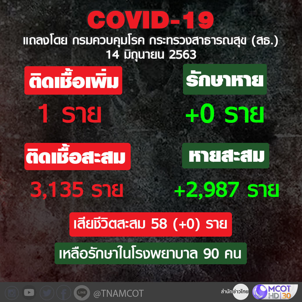 สำนักข่าวไทย14 มิ.ย. -.สถานการณ์โรคโควิด-19 พบผู้ป่วยรายใหม่ 1 ราย กลับมาจากประเทศสหรัฐอเมริกา ผู้ป่วยสะสม 3,135 ราย รักษาในโรงพยาบาล 90 ราย ไม่มีผู้เสียชีวิตเพิ่ม