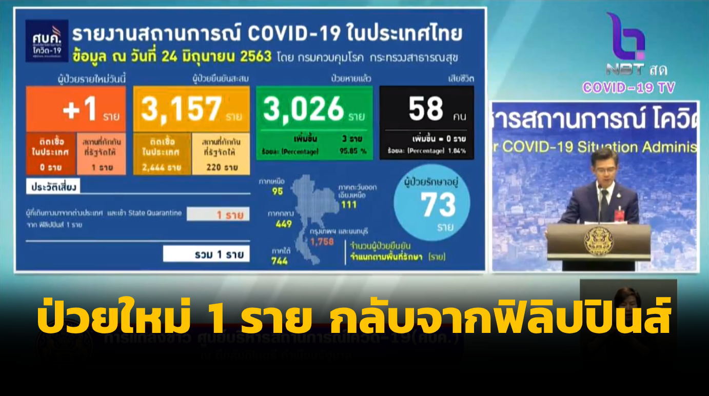 สำนักข่าวไทย 24 มิ.ย. 63 – สถานการณ์โรคโควิด-19 ไทยพบผู้ป่วยรายใหม่ 1 ราย กลับจากฟิลิปปินส์ และเข้า State Quarantine ผู้ป่วยสะสม 3,157 ราย หายป่วยแล้ว 3,026 ราย รักษาใน รพ. 73 ราย เสียชีวิตคงที่ 58 ราย