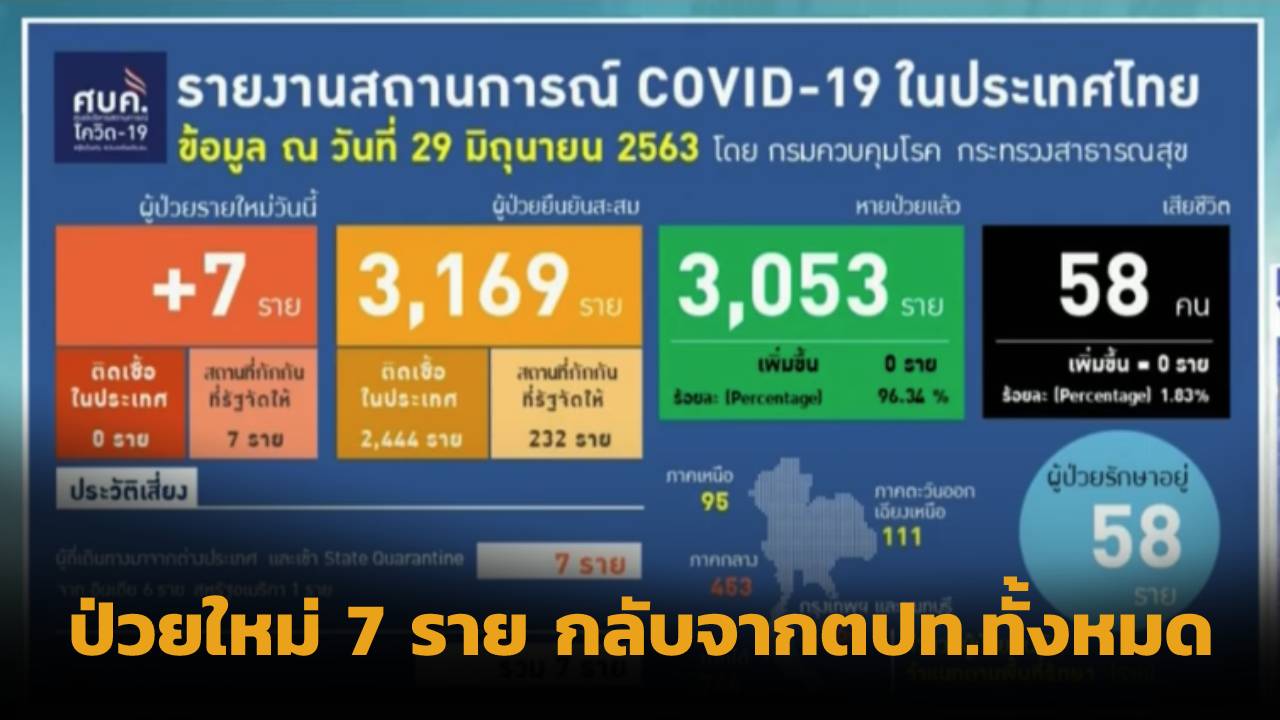 สำนักข่าวไทย 29 มิ.ย.- สถานการณ์โรคโควิด-19 ไทยพบผู้ป่วยรายใหม่ 7 ราย กลับจากอินเดีย 6 และสหรัฐอเมริกา 1 รายผู้ป่วยสะสม 3,169 ราย หายป่วยแล้ว 3,053 ราย รักษาใน รพ. 58 ราย เสียชีวิตคงที่