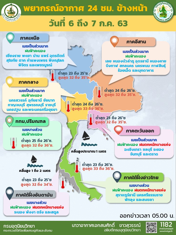 กรมอุตุนิยมวิทยา พยากรณ์อากาศ 24 ชั่วโมงข้างหน้า มรสุมตะวันตกเฉียงใต้กำลังค่อนข้างแรงที่พัดปกคลุมทะเลอันดามันและประเทศไทยเริ่มมีกำลังอ่อนลง ลักษณะเช่นนี้ทำให้บริเวณประเทศไทยมีฝนตกหนักบางแห่งบริเวณภาคตะวันออก และภาคใต้ ส่วนกรุงเทพมหานครและปริมณฑล เมฆบางส่วน กับมีฝนฟ้าคะนอง ร้อยละ 20 ของพื้นที่ อุณหภูมิต่ำสุด 25-26 องศาเซลเซียส อุณหภูมิสูงสุด 32-36 องศาเซลเซียส .