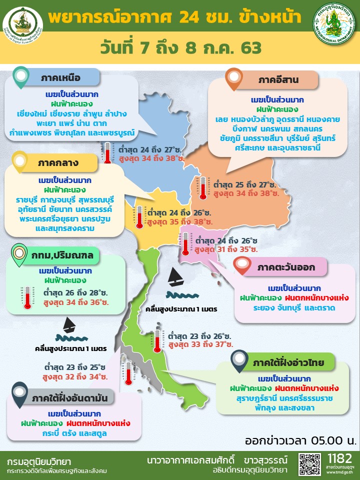 กรมอุตุนิยมวิทยา พยากรณ์อากาศ 24 ชั่วโมงข้างหน้า มรสุมตะวันตกเฉียงใต้พัดปกคลุมทะเลอันดามันและประเทศไทย ประกอบกับมีลมใต้และลมตะวันออกเฉียงใต้พัดเข้ามาปกคลุมภาคตะวันออกเฉียงเหนือและภาคตะวันออก ลักษณะเช่นนี้ทำให้ประเทศไทยยังคงมีฝนตกต่อเนื่อง และมีฝนตกหนักบางแห่งบริเวณภาคตะวันออก และภาคใต้ ส่วนกรุงเทพฯ และปริมณฑล ฝนฟ้าคะนอง 40% ของพื้นที่