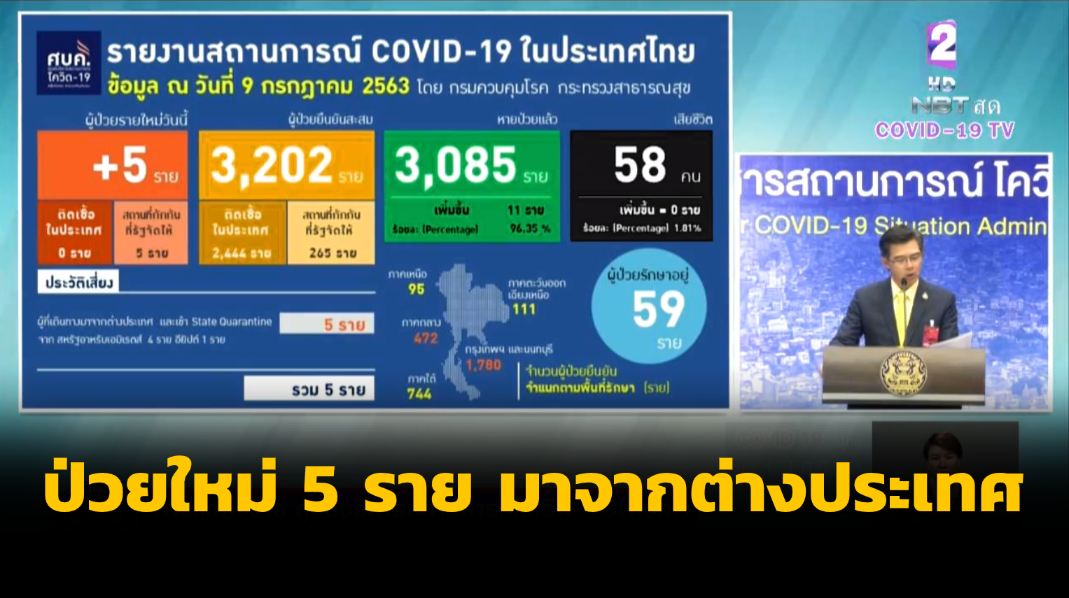 สำนักข่าวไทย 9 ก.ค. 63 – สถานการณ์โรคโควิด-19 ไทยพบผู้ป่วยรายใหม่ 5 ราย มาจากต่างประเทศ และเข้า State Quarantine สะสม 3,202 ราย หายป่วยเพิ่ม 11 ราย สะสม 3,085 ราย เสียชีวิตคงที่ 58 ราย รักษาในโรงพยาบาล 59 ราย