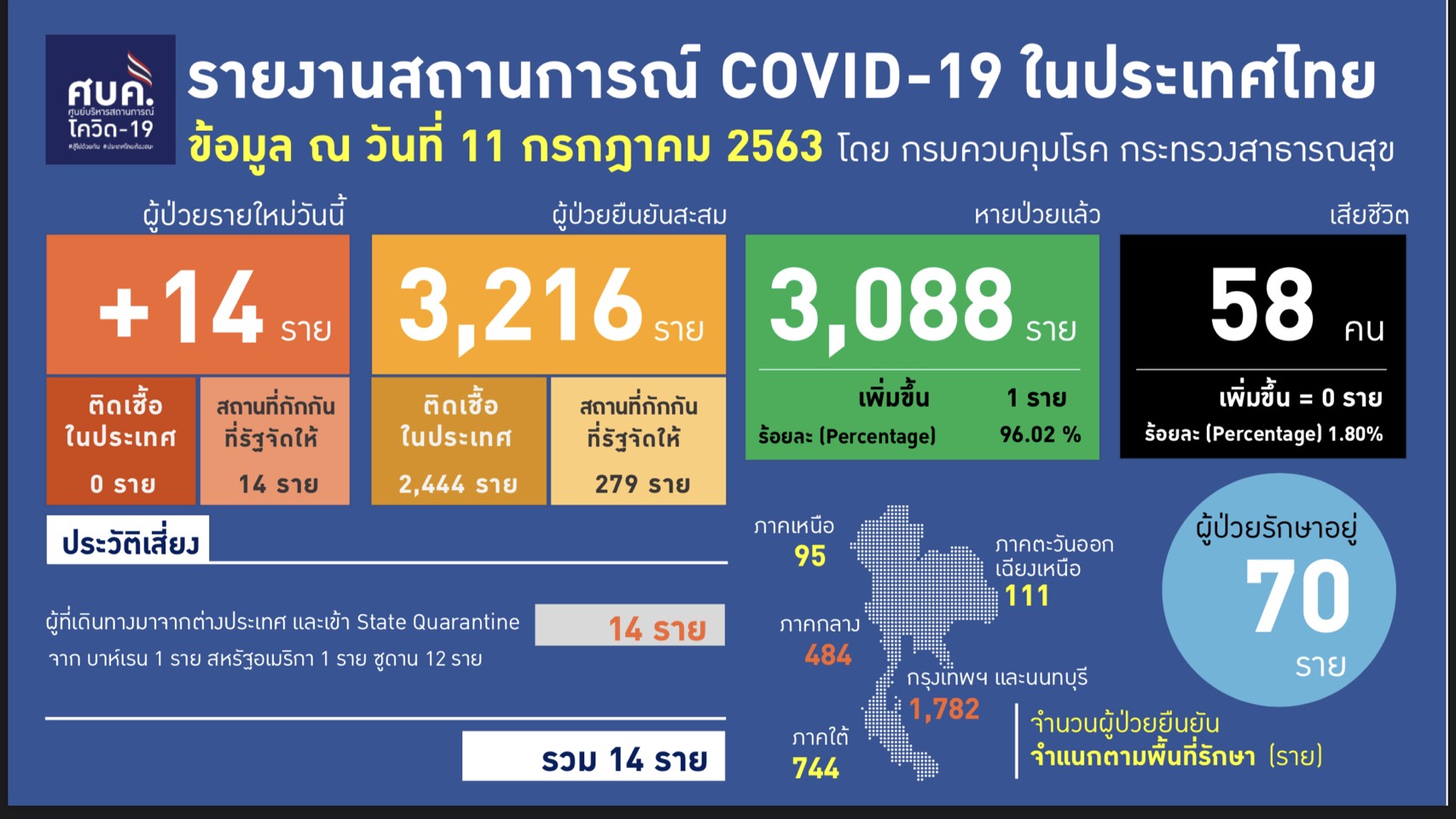 สำนักข่าวไทย 11 ก.ค. 63 – สถานการณ์โรคโควิด-19 ไทยพบผู้ป่วยรายใหม่ 14 ราย เดินทางกลับจากต่างประเทศและเข้า State Quarantine ผู้ป่วยสะสม 3,216 ราย หายป่วยเพิ่ม 1 ราย สะสม 3,088 ราย เสียชีวิตคงที่ 58 ราย อยู่ รพ. 70 ราย