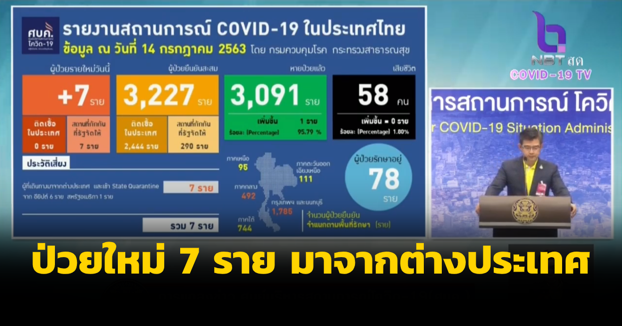สำนักข่าวไทย 14 ก.ค. 63 – สถานการณ์โรคโควิด-19 ไทยพบผู้ป่วยรายใหม่ 7 ราย เดินทางกลับจากต่างประเทศและเข้า State Quarantine สะสม 3,227 ราย หายป่วยเพิ่ม 1 ราย สะสม 3,091 ราย เสียชีวิตคงที่ 58 ราย อยู่ รพ. 78 ราย