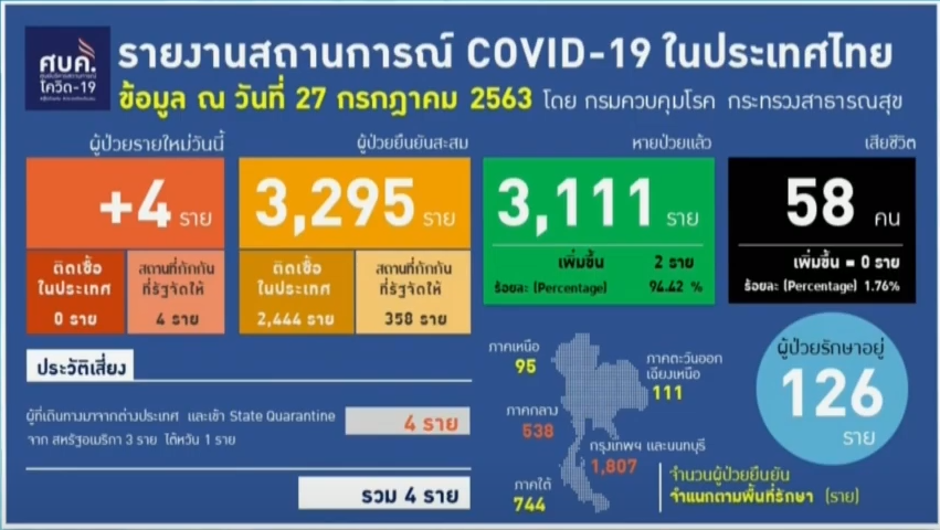 สำนักข่าวไทย 27 ก.ค. 63 – สถานการณ์โควิด-19 ไทยพบผู้ป่วยรายใหม่ 4 ราย มาจากต่างประเทศและพักใน State Quarantine ผู้ป่วยยืนยันสะสม 3,295 ราย หายป่วยเพิ่ม 2 ราย สะสม 3,111 ราย รักษาในโรงพยาบาล 126 ราย เสียชีวิตคงที่..