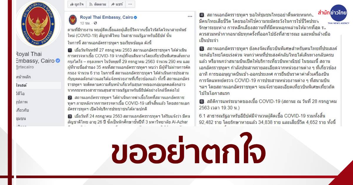 สถานเอกอัครราชทูต ณ กรุงไคโร สาธารณรัฐอาหรับอียิปต์ โพสต์ข้อความผ่านเฟซบุ๊ก ระบุข้อความว่า ตามที่มีรายงานพบผู้ติดเชื้อและผู้เสียชีวิตจากเชื้อไวรัสโคโรนาสายพันธ์ใหม่ (COVID-19) สัญชาติไทยในสาธารณรัฐอาหรับอียิปต์ เมื่อวันจันทร์ที่ 27 กรกฎาคม 2563 สถานเอกอัครราชทูตฯ ได้ดำเนินการตรวจหาเชื้อ COVID-19 จากผู้ที่จะเดินทางโดยเที่ยวบินพิเศษเส้นทางกรุงไคโร- กรุงเทพฯ วันพรุ่งนี้(29 ก.ค.) จำนวน 290 คน และผู้ที่มีรายชื่อสำรอง 35 คนที่สถานเอกอัครราชทูตฯ พบว่ามีผู้ที่ไม่ผ่านการคัดกรอง จำนวน 6 ราย