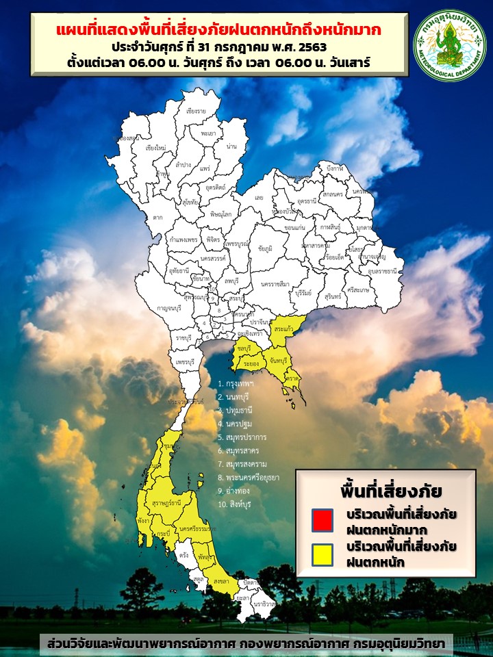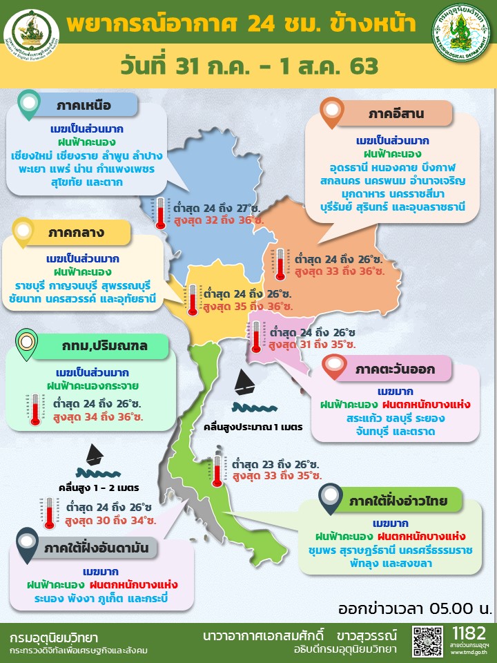 กรมอุตุนิยมวิทยา พยากรณ์อากาศ 24 ชั่วโมงข้างหน้า มรสุมตะวันตกเฉียงใต้ที่พัดปกคลุมทะเลอันดามันและประเทศไทยมีกำลังปานกลาง ลักษณะเช่นนี้ทำให้ประเทศไทยมีฝนตกหนักบางแห่งในภาคตะวันออกและภาคใต้ ขอให้ประชาชนบริเวณดังกล่าวระวังอันตรายจากฝนที่ตกหนักไว้ด้วย