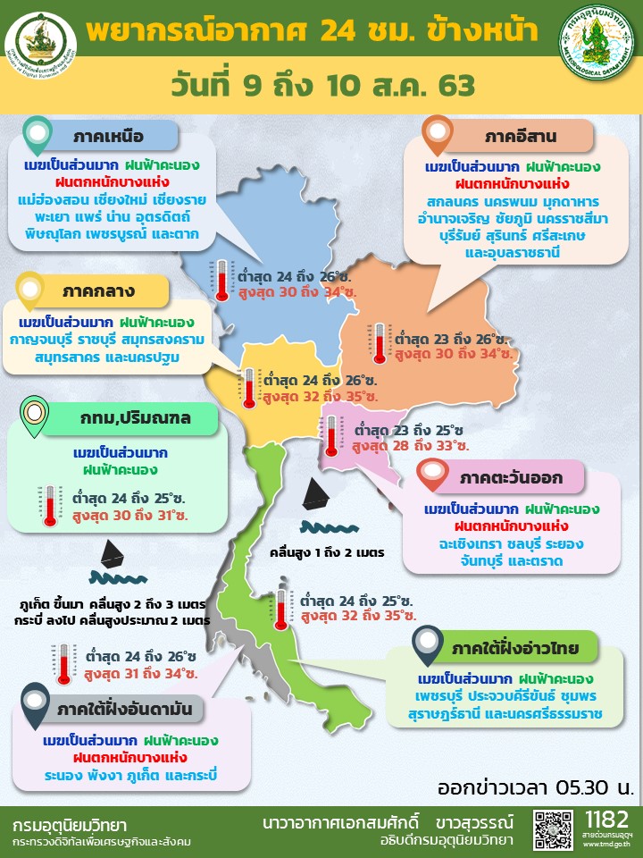 กรมอุตุนิยมวิทยา พยากรณ์อากาศ 24 ชั่วโมงข้างหน้า ร่องมรสุมได้เลื่อนขึ้นไปพาดผ่านภาคเหนือตอนบนและภาคตะวันออกเฉียงเหนือตอนบน เข้าสู่หย่อมความกดอากาศต่ำบริเวณทะเลจีนใต้ตอนบน ประกอบกับมรสุมตะวันตกเฉียงใต้ที่พัดปกคลุมทะเลอันดามัน ประเทศไทย และอ่าวไทยมีกำลังแรง ทำให้ยังมีฝนตกหนักบางพื้นที่บริเวณภาคเหนือ ภาคตะวันออกเฉียงเหนือ ภาคตะวันออก และภาคใต้ฝั่งตะวันตก ขอให้ประชาชนที่อาศัยในพื้นที่เสี่ยงภัยบริเวณภาคเหนือและภาคใต้ฝั่งตะวันตก ระวังอันตรายจากฝนตกหนักและฝนที่ตกสะสมไว้ด้วย อาจทำให้เกิดน้ำท่วมฉับพลันและน้ำป่าไหลหลากได้