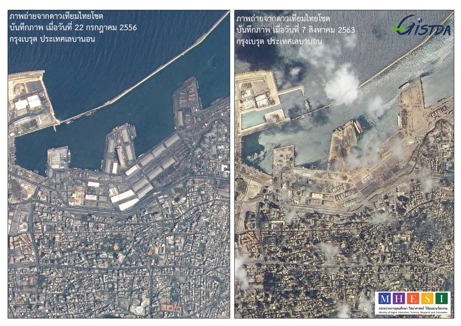 สำนักข่าวไทย 9 ส.ค.- กระทรวงการอุดมศึกษา วิทยาศาสตร์ วิจัย และนวัตกรรม โดย สำนักงานพัฒนาเทคโนโลยีอวกาศและภูมิสารสนเทศ (องค์การมหาชน) หรือ GISTDA เผยภาพจากดาวเทียม THEOS ซึ่งบันทึกภาพเมื่อวันศุกร์ที่ 7 สิงหาคม 2563 เวลา 15:22 น. เปรียบเทียบก่อนและหลังเกิดเหตุระเบิด