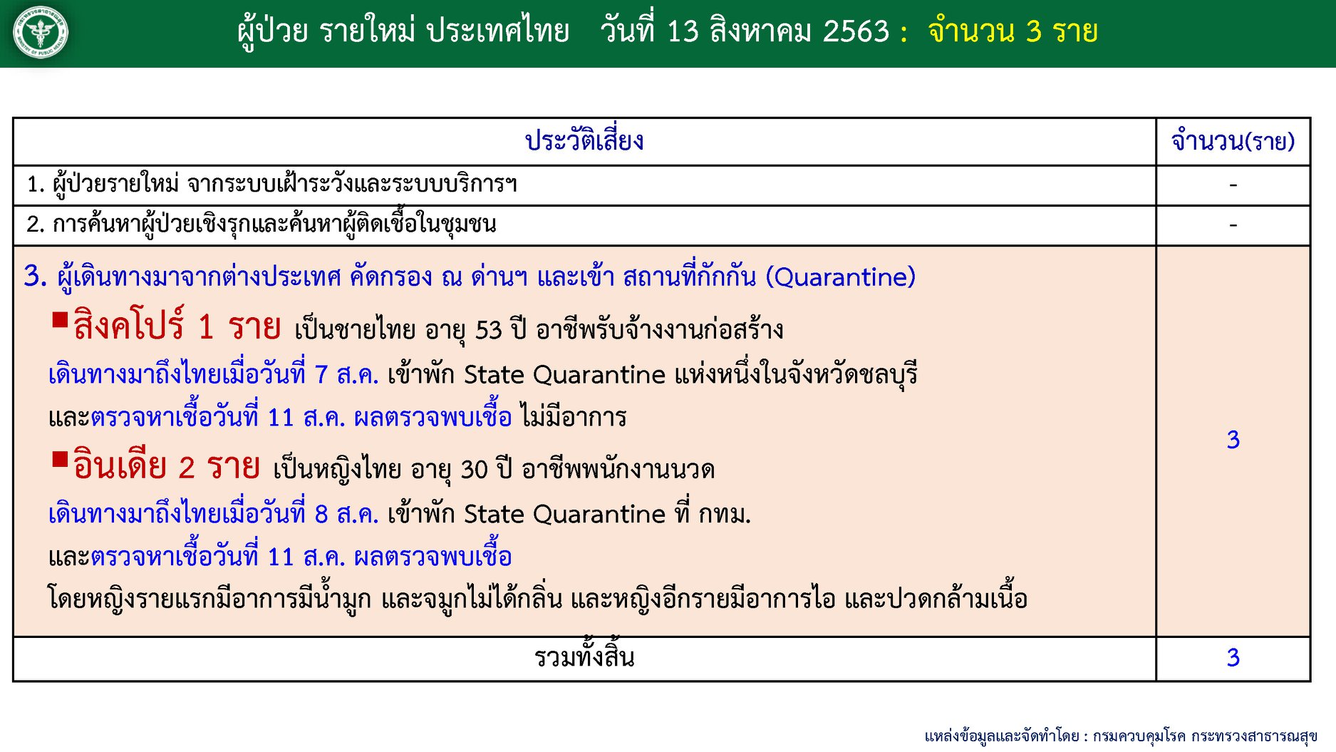 สิงคโปร์ 1 ราย ชายไทยอายุ 53 ปี เดินทางมาถึงไทยวันที่ 7 ส.ค. 63 เข้าพักที่State Quarantine ที่ จ.ชลบุรี ตรวจหาเชื้อวันที่ 11 ส.ค. 63 ตรวจพบเชื้อไม่แสดงอาการ