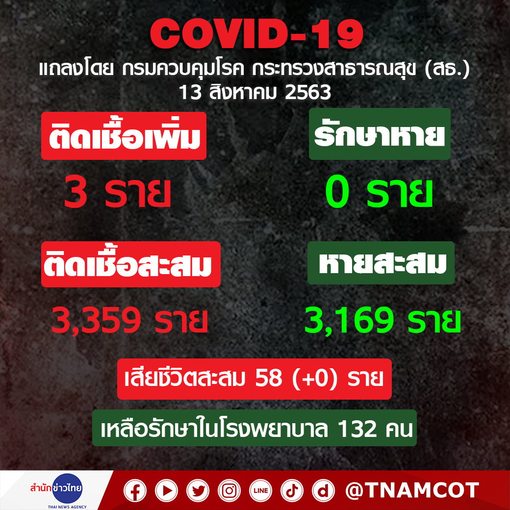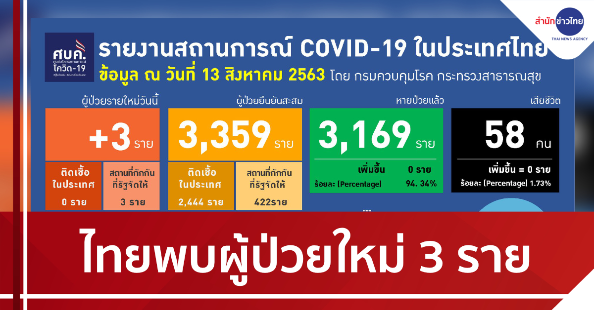 สำนักข่าวไทย 13 ส.ค. – สถานการณ์การติดเชื้อ COVID-19 ในประเทศไทย พบผู้ป่วยรายใหม่ 3 ราย ผู้ป่วยยืนยันสะสมอยู่ที่ 3,359 ราย หายป่วยแล้ว 3,169 ราย เสียชีวิตสะสม 58 ราย