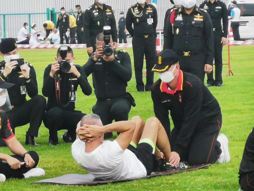 ผู้สื่อข่าวรายงานว่า ขณะที่ผู้บัญชาการทหารบกตรวจเยี่ยมการทดสอบสถานีต่าง ๆ ได้หยุดดูที่ท่าโหนยกเข่าแตะศอก โดยร่วมทดสอบกับกำลังพล ได้จำนวน 8 ครั้ง จากนั้นได้มาร่วมทดสอบท่าลุกนั่ง ได้ 66 ครั้ง และดันพื้น 47 ครั้ง โยนบอลยาง ระยะ 6.10 เมตร ก่อนจะเดินเยี่ยมชมกำลังพลที่ทดสอบด่านต่าง ๆ ต่อไป