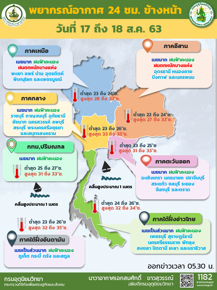 กรมอุตุนิยมวิทยา พยากรณ์อากาศ 24 ชั่วโมงข้างหน้า มรสุมตะวันตกเฉียงใต้พัดปกคลุมทะเลอันดามันตอนบน ประเทศไทย และอ่าวไทย ประกอบกับมีหย่อมความกดอากาศต่ำปกคลุมบริเวณประเทศเวียดนามตอนบน ลักษณะเช่นนี้ทำให้ประเทศไทยตอนบนมีฝนต่อเนื่อง และมีฝนตกหนักบางแห่งในบริเวณทางด้านตะวันออกของภาคเหนือ และภาคตะวันออกเฉียงเหนือตอนบน ขอให้ประชาชนที่อาศัยในพื้นที่เสี่ยงภัยบริเวณดังกล่าว ระวังอันตรายจากฝนตกหนักและฝนที่ตกสะสมไว้ด้วย