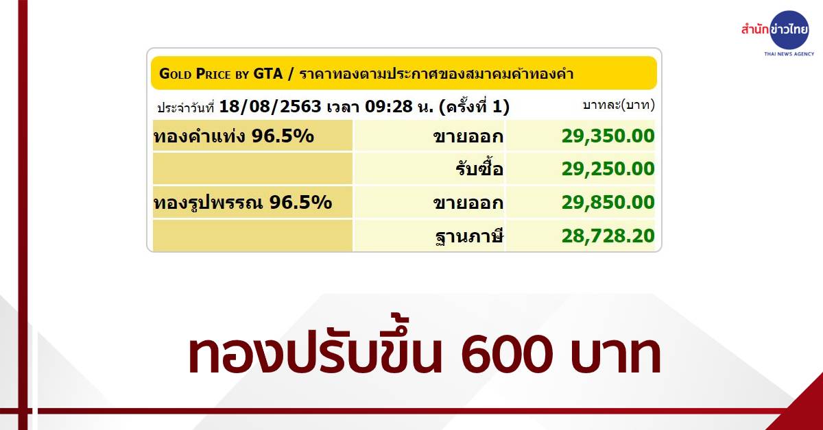 กทม. 18 ส.ค.-สมาคมค้าทองคำ รายงานราคาทองคำเช้าวันนี้ (18 ส.ค.) ปรับขึ้น 600 บาท ทองคำแท่ง รับซื้อบาทละ 29,250 บาท ขายออกบาทละ 29,350 บาท ทองรูปพรรณ 96.5% รับซื้อบาทละ 28,728.20 บาท ขายออกบาทละ 29,850 บาท.-สำนักข่าวไทย