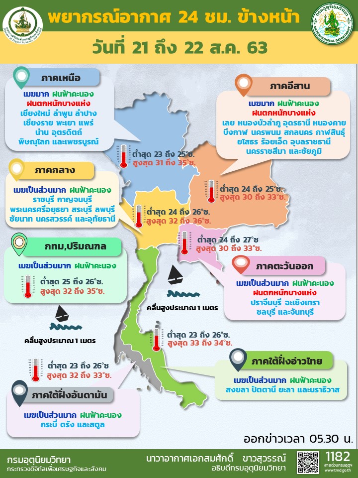 กรมอุตุนิยมวิทยา 21 ส.ค.- กรมอุตุฯ พยากรณ์อากาศ 24 ชม.ข้างหน้า ภาคเหนือ ภาคตะวันออกเฉียงเหนือ และภาคตะวันออก มีฝนตกหนักบางแห่ง ขอให้ประชาชนในพื้นที่เสี่ยงภัยระวังอันตรายจากฝนตกหนักและฝนตกสะสม ซึ่งอาจทำให้เกิดน้ำท่วมฉับพลันและน้ำป่าไหลหลาก ขณะที่ กทม.-ปริมณฑล ฝนฟ้าคะนอง 60% ของพื้นที่
