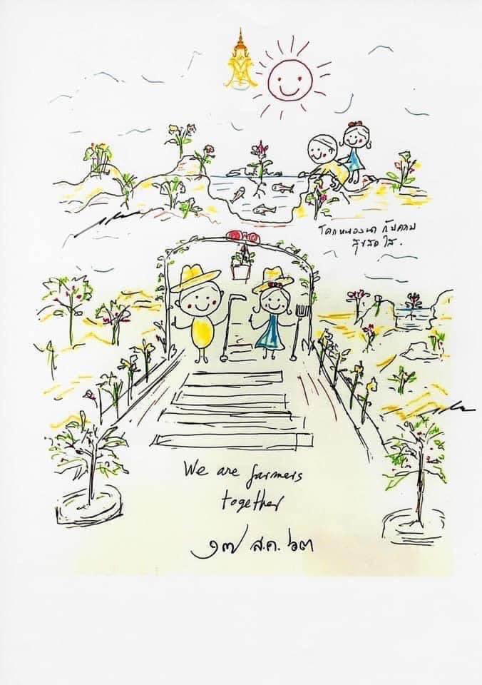 แบบที่ 2 เป็นภาพวาดฝีพระหัตถ์พืชผลทางการเกษตรที่ได้ลงกล้าเพาะปลูกผลิดอกออกผลเบ่งบานอย่างสดใส พร้อมพระราชทานข้อความว่า “โคกหนองนากับความสุขสดใส” “We are farmers together” ๑๗ ส.ค.๖๓