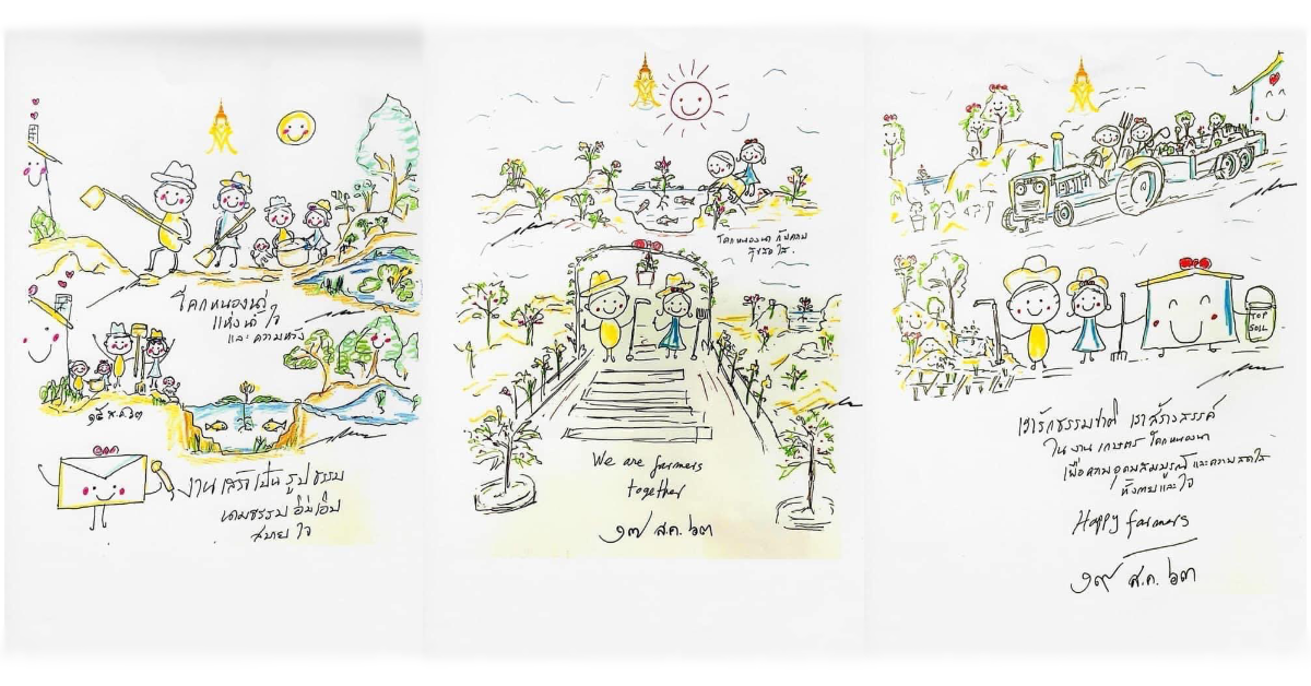แบบที่ 3 เป็นภาพวาดฝีพระหัตถ์ความเขียวขจีสดใสของธรรมชาติ และพระราชทานข้อความว่า “เรารักธรรมชาติ เราสร้างสรรค์ในงานเกษตร โคกหนองนา เพื่อความอุดมสมบูรณ์และความสดใสทั้งกายและใจ Happy farmers”๑๙ ส.ค.๖๓