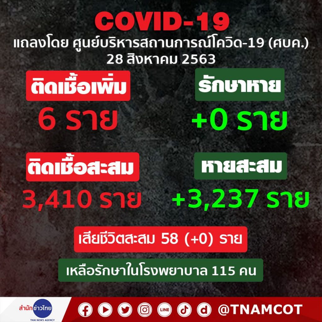 สำนักข่าวไทย 28 ส.ค. – สถานการณ์การติดเชื้อ COVID-19 ในประเทศไทย พบผู้ป่วยรายใหม่ 6 ราย ผู้ป่วยยืนยันสะสมอยู่ที่ 3,410 ราย หายป่วยแล้ว 3,237 ราย เสียชีวิตสะสม 58 ราย