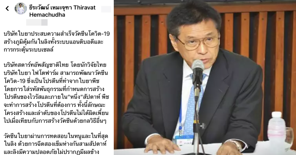 ศ.นพ.ธีระวัฒน์ เหมะจุฑา ศาสตราจารย์สาขาประสาทวิทยา ภาควิชาอายุรศาสตร์ คณะแพทยศาสตร์ จุฬาลงกรณ์มหาวิทยาลัย และผู้อำนวยการศูนย์ปฏิบัติการโรคทางสมอง รพ.จุฬาลงกรณ์ หัวหน้าศูนย์วิทยาศาสตร์สุขภาพโรคอุบัติใหม่ คณะแพทยศาสตร์ รพ.จุฬาลงกรณ์ สภากาชาดไทย เปิดเผยผ่านเฟซบุ๊ก “ธีระวัฒน์ เหมะจุฑา Thiravat Hemachudha” วันนี้ (29 ส.ค.) ว่า บริษัทใบยาประสบความสำเร็จวัคซีนโควิด-19 สร้างภูมิคุ้มกันในลิงทั้งระบบแอนติบอดีและการกระตุ้นระบบเซลล์
