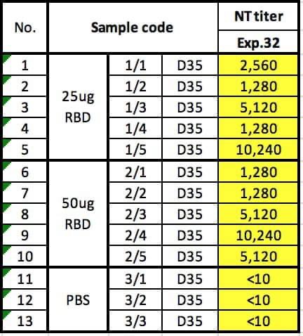 ในตารางแสดงให้เห็นถึงการใช้วัคซีนในขนาดต่างๆโดยที่สามารถกระตุ้นภูมิคุ้มกันในน้ำเหลืองที่ยับยั้งไวรัสได้ และเมื่อเทียบกับ “ลิง” ที่ไม่ได้ฉีดวัคซีนในกลุ่มสุดท้าย