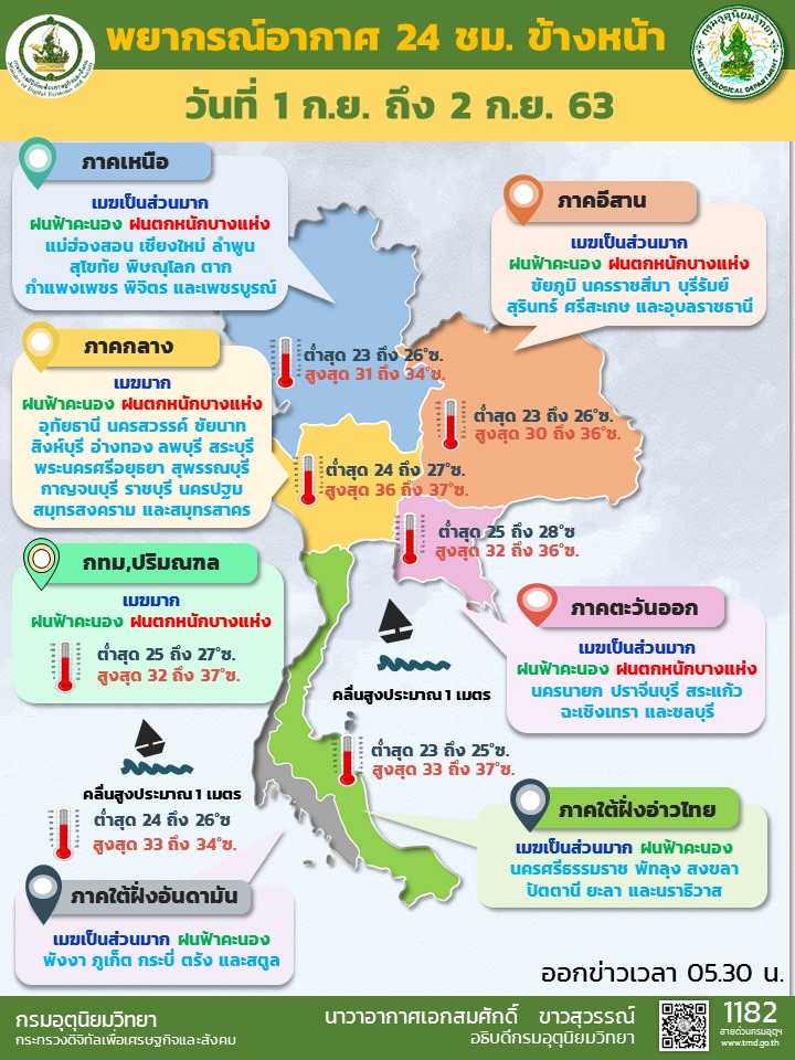กรมอุตุนิยมวิทยา พยากรณ์อากาศ 24 ชั่วโมงข้างหน้า ร่องมรสุมกำลังแรงพาดผ่านภาคเหนือตอนล่าง ภาคกลาง และภาคตะวันออกเฉียงเหนือตอนล่าง ลักษณะเช่นนี้ทำให้บริเวณดังกล่าวมีฝนเพิ่มขึ้นกับมีฝนตกหนักบางแห่ง ขอให้ประชาชนบริเวณพื้นที่เสี่ยงภัยในภาคเหนือตอนล่าง ภาคกลาง และภาคตะวันออกเฉียงเหนือตอนล่างระวังอันตรายจากฝนที่ตกหนักไว้ด้วย อาจทำให้เกิดน้ำท่วมฉับพลัน น้ำป่าไหลหลากได้ ส่วนมรสุมตะวันตกเฉียงใต้ยังคงพัดปกคลุมทะเลอันดามัน และภาคใต้