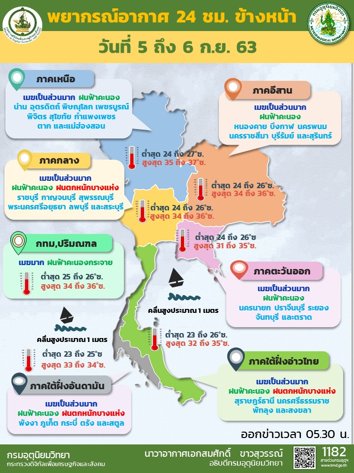 กรมอุตุนิยมวิทยา พยากรณ์อากาศ 24 ชั่วโมงข้างหน้า ร่องมรสุมกำลังอ่อนพาดผ่านภาคเหนือตอนล่าง ภาคกลางตอนบน และภาคตะวันออกเฉียงเหนือตอนบน ประกอบกับมรสุมตะวันตกเฉียงใต้พัดปกคลุมทะเลอันดามัน ประเทศไทย และอ่าวไทย ลักษณะเช่นนี้ทำให้บริเวณดังกล่าวยังคงมีฝนฟ้าคะนองเกิดขึ้นและมีฝนตกหนักบางแห่งในภาคใต้ ขอให้ประชาชนบริเวณพื้นที่เสี่ยงภัย ระวังอันตรายจากฝนที่ตกหนักในระยะนี้